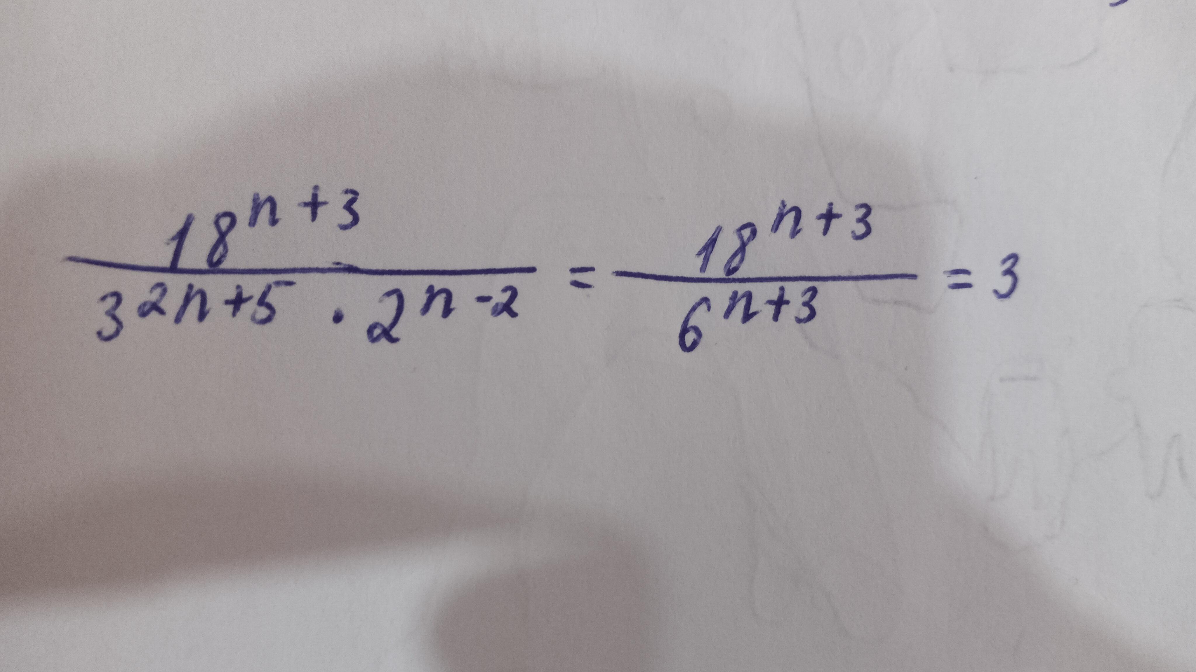 18^(n+3)/3^(2n+5)*2^(n-2)=3^(2n+6)*2^(n+3)/3^(2n+5)*2^(n-2)=3^(2n+6-2n-5)*2^(n+3-n+2)=3*2^5=3*32=96