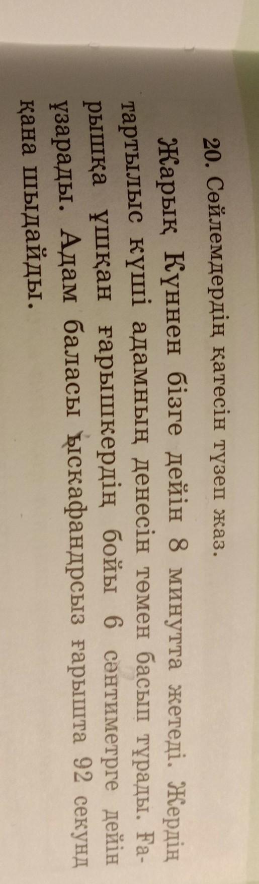 Жарық Күннен бізге дейін 8 минутта жетеді. Жердің тартылыс күші адамның денесін төмен басып тұрады. Faрышқа ұшқан ғарышкердің бойы 6 сантиметрге дейін ұзарады. Адам баласы скафандрсыз ғарышта 92 секунд қана шыдайды.