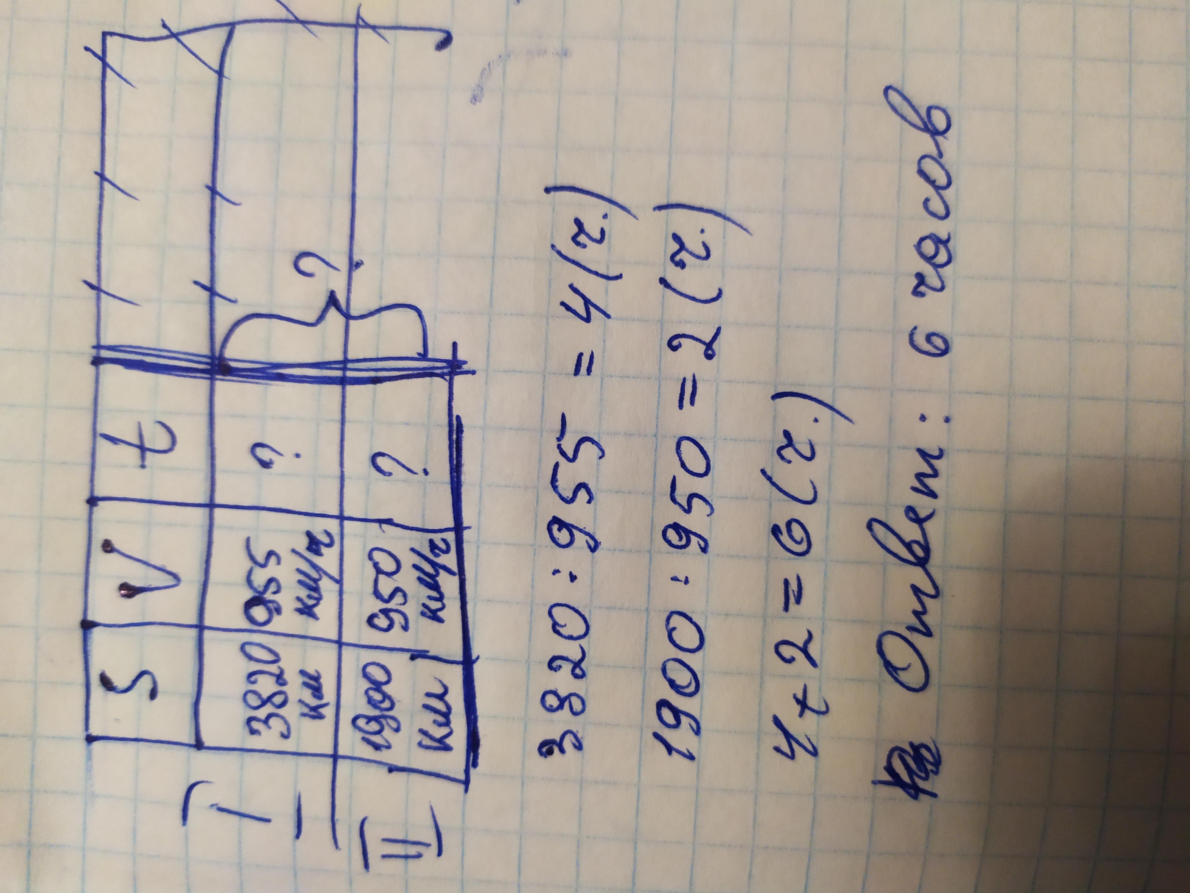 Самолёт пролетел 3820 км со скоростью 955 км/ч,затем он уменьшил скорость до 950 км/ч и с этой скоростью пролетел ещё 1900 км.Сколько времени затратил самолёт на весь рейс?(можно краткую запись,то есть обозначение буквами что это, и цифра, пожалуйста.)