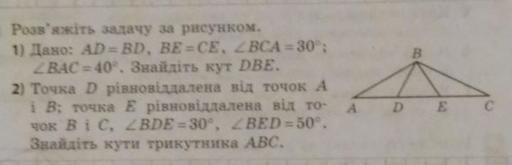 Трикутники ВDA i BEC - рівнобедренні, тому що сторони рівні, а отже і кути при основі рівні. Тобто ВСА=СВА=30, а ВАС=ABC=40