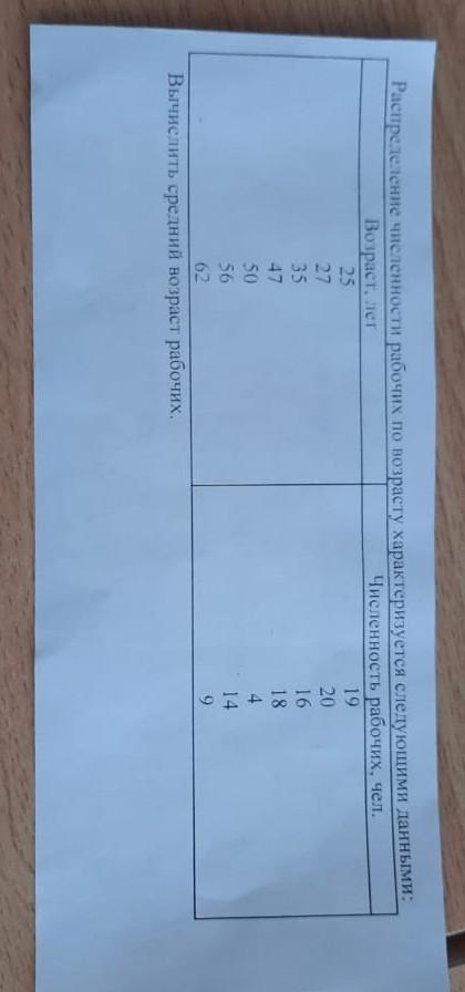 Объяснение: (25*19+27*20+35*16+47*18+50*4+56*14+62*9)/100=39.63