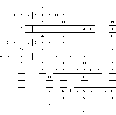 1. Совокупность всех корней одного растения.2. Запасающие корни: главный корень утолщается, становится сочным, в нём накапливаются питательные вещества (морковь, свекла).3. Запасающие корни, в которых питательные вещества откладываются в придаточных корнях, образуя утолщения (георгин, ночная фиалка).4. Корневая система, образующаяся при слабом росте или отмирании главного корня и развитии придаточных корней, одинаковых по длине и толщине (пшеница, рожь, подорожник).5. Он происходит за счёт деления клеток кончика корня, где находится образовательная ткань.6. Корни, образующиеся на главном корне и разрастающиеся в разные стороны.7. По ним передвигаются вода и минеральные соли от корней к листьям.8. Процесс, происходящий в проводящих сосудах корней, обеспечивающий снабжение водой надземных органов растения.9. Корневая система, образующаяся при развитии главного корня, имеющего вид стержня и дающего основу для всей корневой системы растения.10. Корни, образующиеся на нижней части стебля, ветвятся, дают мочковатую корневую систему (кукуруза).11. Корни, развивающиеся на подземных боковых корнях, растущие вверх поднимаясь над поверхностью почвы, и снабжают подземные корни воздухом.12. Многослойный конусовидный колпачок из живых паренхимных клеток.13. Нежные тонкие выросты наружных клеток корня, поглощающие из почвы воду с растворёнными в ней минеральными веществами.14. Верхний плодородный слой земли, являющийся самостоятельным природным телом.
