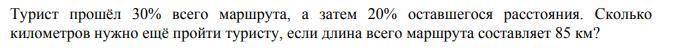 Турист прошёл 30% всего маршрута, а затем 20% оставшегося расстояния. Сколько километров нужно ещё пройти туристу, если длина всего маршрута составляет 85 км?