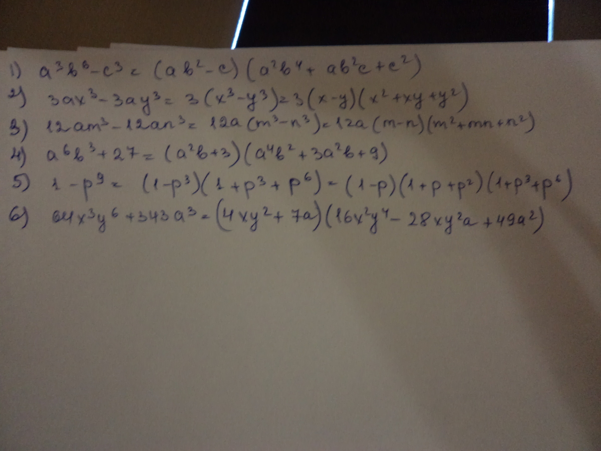 4) a^6b^3+27; 5) 1-p^9; 6) 64x^3y^6+343a^3.