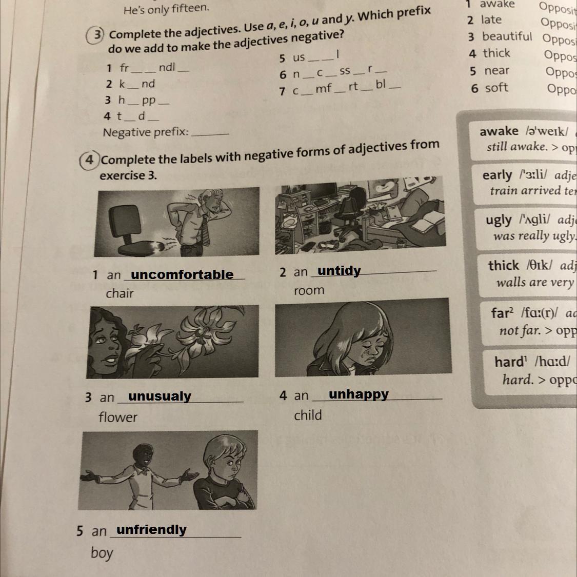 1 uncomfortable 2 untidy 3 unusual 4 unhappy 5 unfriendly