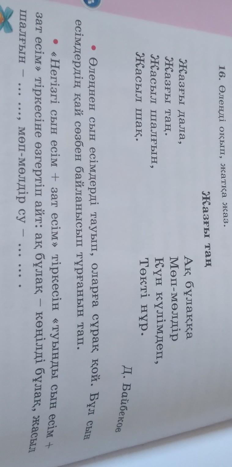 • Өлеңнен сын есімдерді тауып, оларға сұрақ қой. Бұл сын