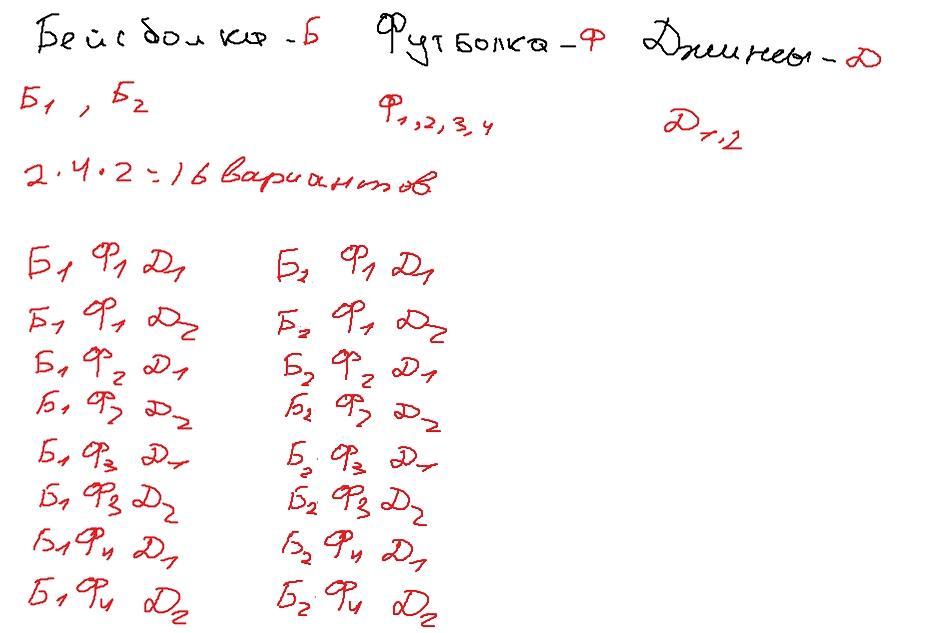 2) Здесь я обозначил разные цвета одежды разными цифрами. Например, две бейсболки это б1 и б2. Получилось 16 вариантов (см. 2 фото)