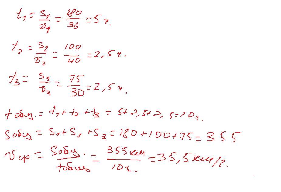 3) Так как все три отрезка разные, мы не можем найти среднее арифметитическое всех скоростей. Нам нужно найти время для каждого отрезка, общее расстояние и поделить расстояние на общее время. (см. 3 фото) Получилось 35.5 км/ч