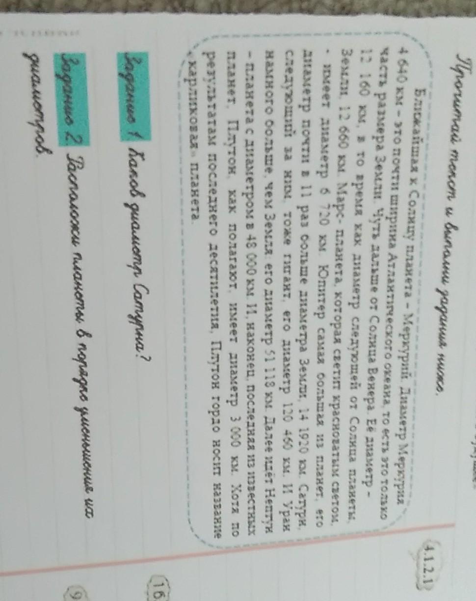 1Диаметр Сатурна 120 460 км. 2 Юпитер 14 1920, Сатурн 120 460, Нептун 48 000 , Уран 51 118 , Земля 14 1920 , Венера 12 160, , Марс 6 720, Миркурий 4 640, Плутон 3 000