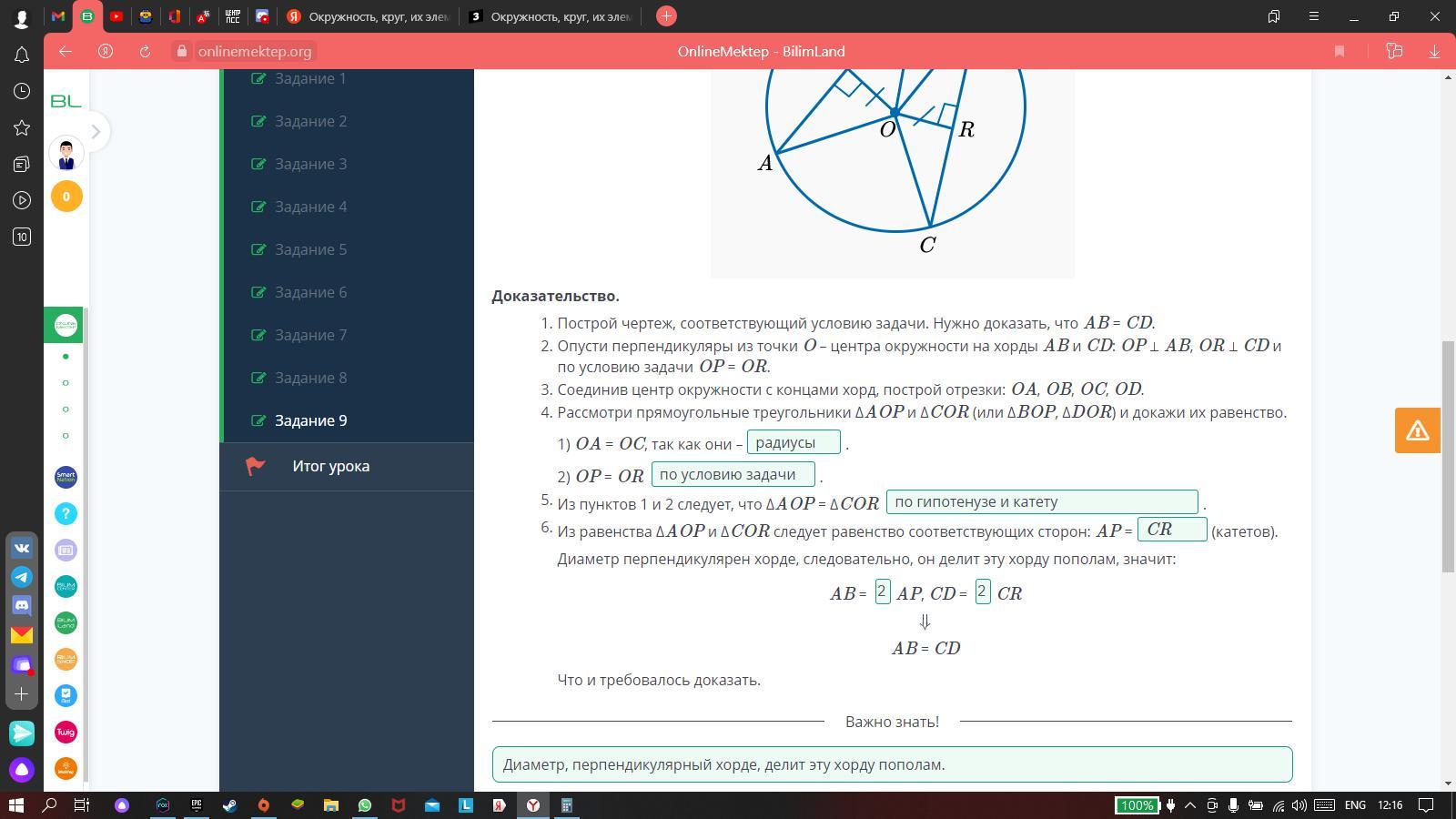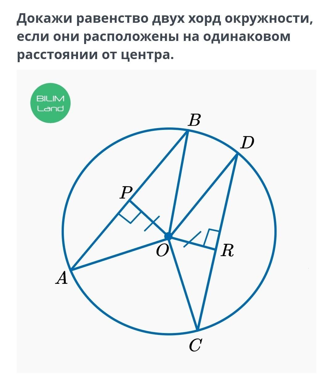 Докажи равенство двух хорд окружности, если они расположены на одинаковом расстоянии от центра.