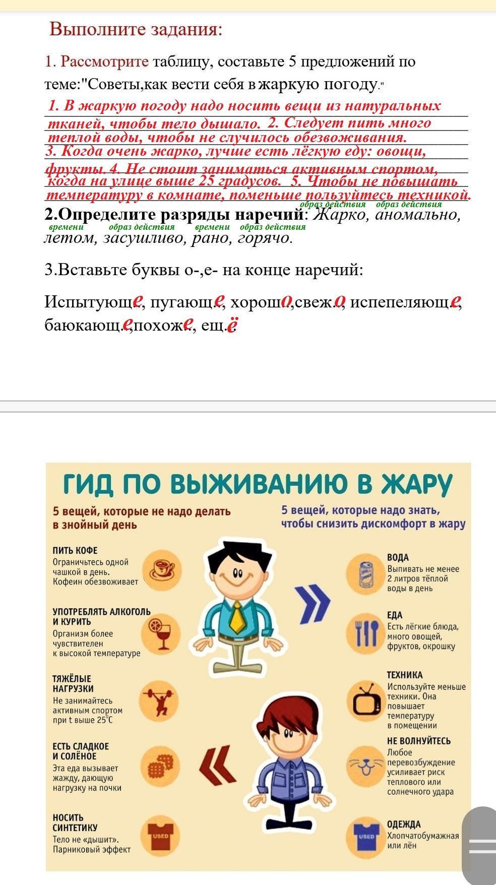 В жаркую погоду желательно пить воду и воздержаться от кофе. Кушать только лёгкую пищу.В жаркий дни не стоит есть много сладкого и соленого это вызывает жажду,и нагружает почки. Лучше всего воздержаться от долгого использования различных техник, а в место этого заняться спортом или просто выйти на свежий воздух. Желательно одевайтесь в хлопчатобумажную одежду или в одежду из лёна.
