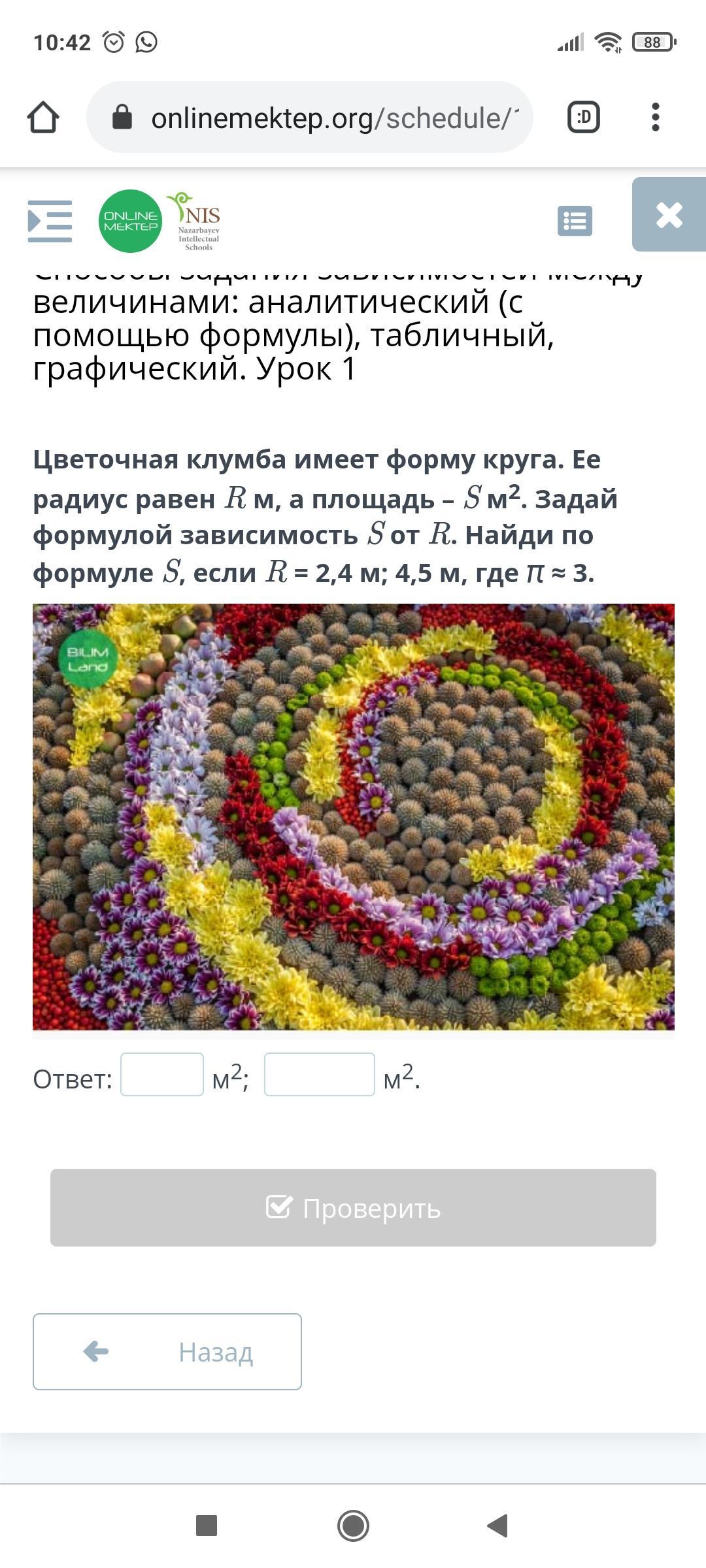 Цветочная клумба имеет форму круга. Ее радиус равен R м, а площадь – S м2. Задай формулой зависимость S от R. Найди по формуле S, если R = 2,4 м; 4,5 м, где π ≈ 3.Способы задания зависимостей между величинами :аналитический (с помощью формулы),табличный,графический.Урок 1