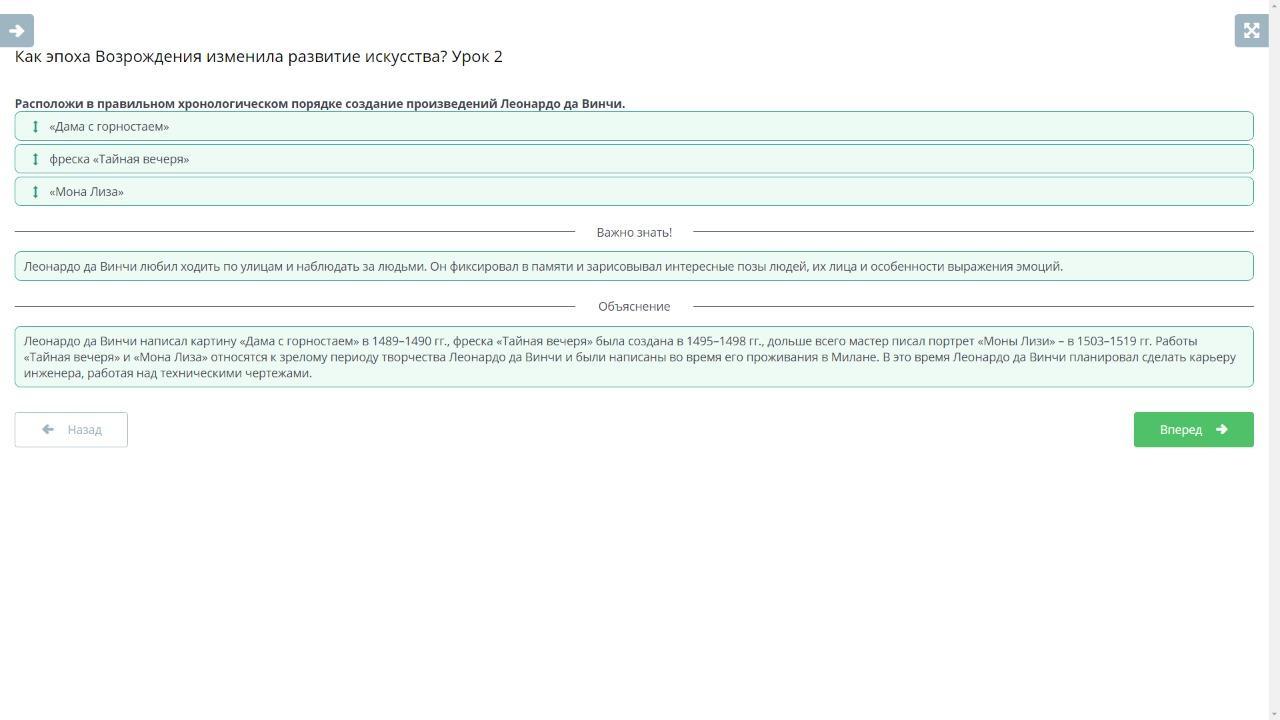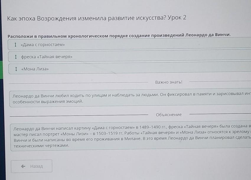 Расположи в правильном хронологическом порядке создание произведений Леонардо да Винчи.