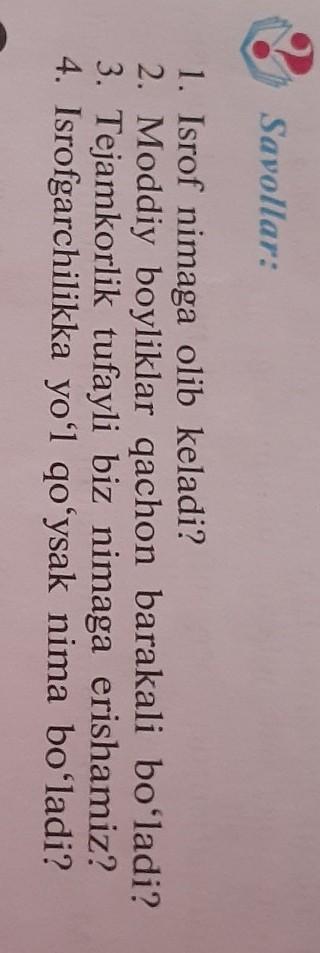 Ответ: 1:Tabiatni asramaslik yomon oqibatlarga olib keladi.Zavod,fabrika,avtoulovlardan chiqayotgan tutun va gazlar havoni ifloslantiradi.Havo buzilsa ,odamlarning nafas olishi qiynaladi,har xil kasalliklar kõpayadi. Daryo,kõllarning suvi ifloslarsa,jonivorlar ham zaharlanadi va nobud bõladi.Atrof-muhitning ifloslanishi õsimliklarga ham zarar keltiradi, ularning hosildorligi kamayadi. 2: Moddiy boyliklarni qachonki asrab avaylasak, keragidanda oshiq sarf qilmasak, isrofgarchilikni bartaraf etsakgina bizning moddiy boyliklarimiz barakali bo'ladi. 3: Tejamkorlik orqali birinchi o'rinda atrof muxitni tozaligini saqlab qolishga erishish mumkun. Oshiqcha zararli moddalar bilan ifloslantirmay xavoni, oz sog'ligimizga xavf keltirish oldini olishimiz mumkun. 4: Qisqa qilib aytsam xamma narsani xaddan ziyod ko'p isrof qilinsa, o'sha narsa tezroq tugap qolishligi xavfi, yanada tezroq kelishi mumkun. Shuning uchun tabiatni qõriqlash va asrash har bir insonning muqaddas burchidir .Va shuning bilan isrofgarchilikni oldini olishxam, insonning eng katta burchidur!