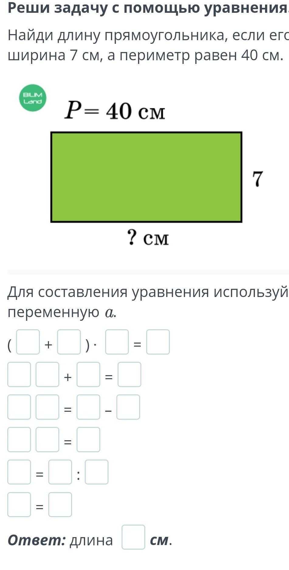 Найди длину прямоугольника, если его ширина 7 см, а периметр равен 40 см.
