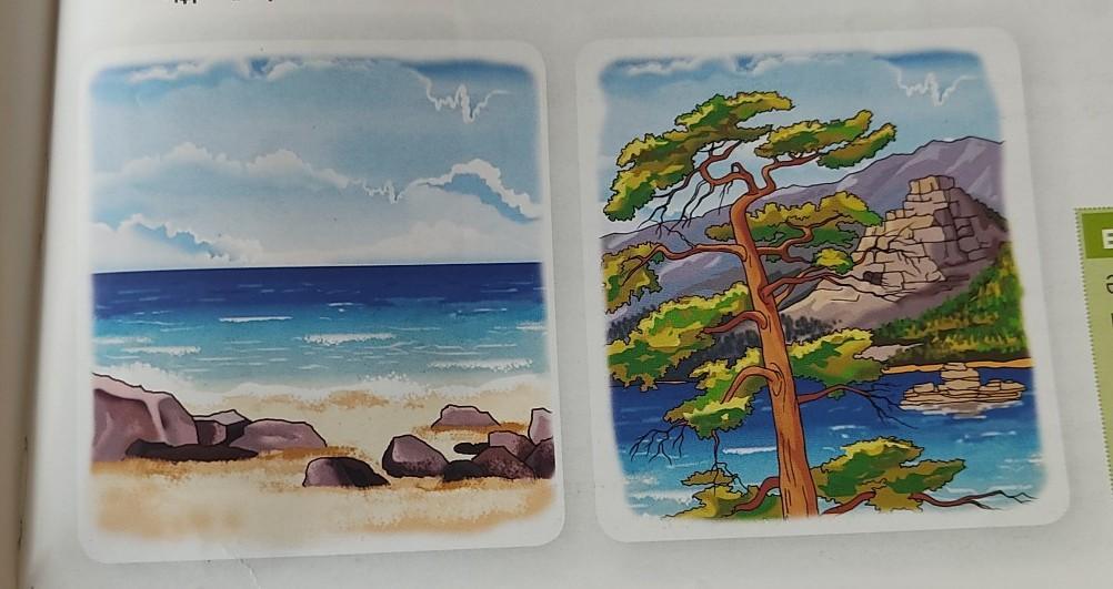 Алғашқы суретте әдемі, мөлдір теңіз бар.Әдемі жағалау, құстар және олардың әдемі әндері.Әдемі, көгілдір аспан. бейнеленген.
