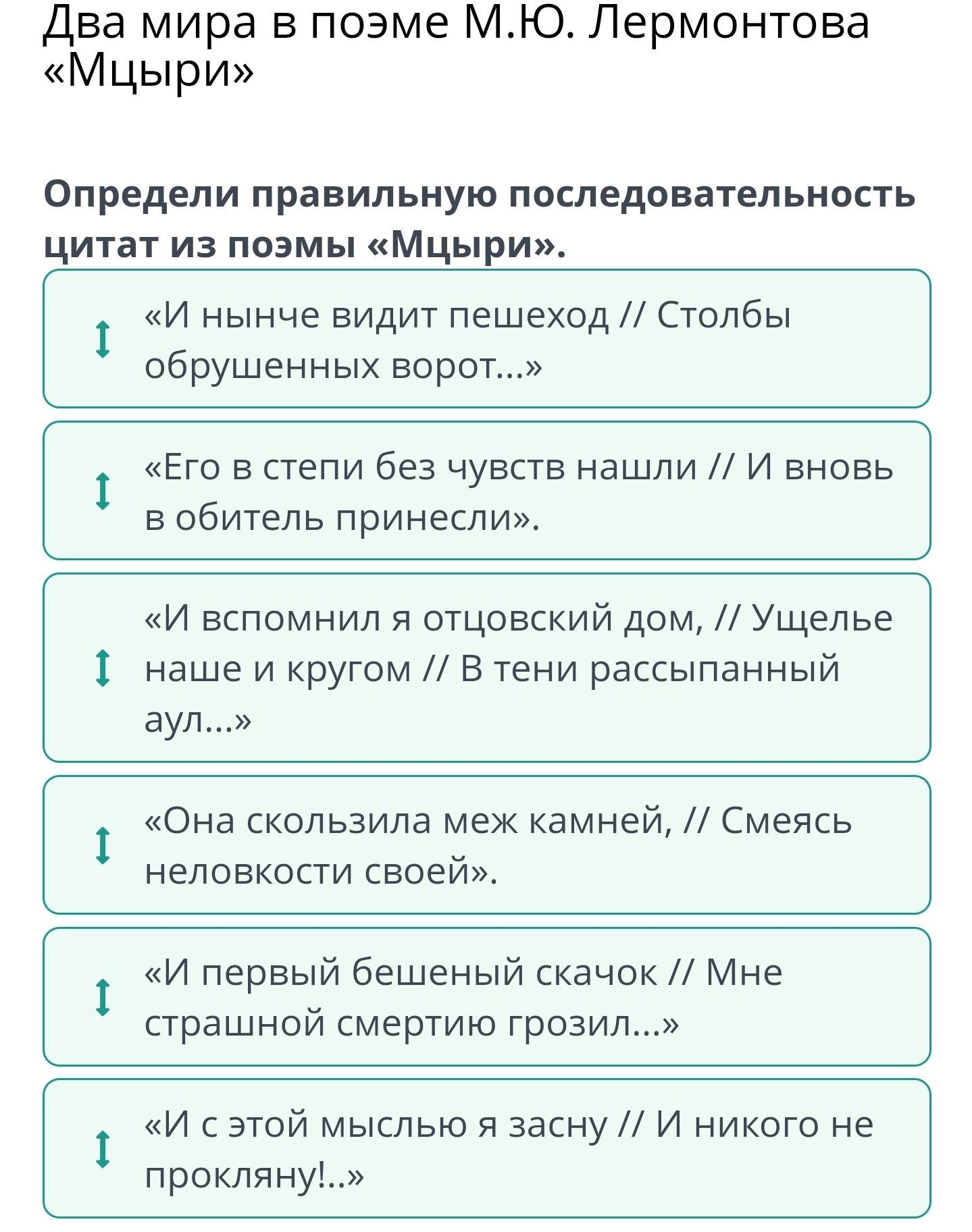 Определи правильную последовательность цитат из поэмы «Мцыри».