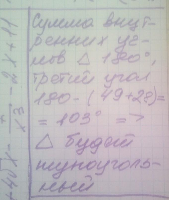 Подскажите пожалуйста!!! Вычисли третий угол треугольника, если два угла этого треугольника равна 49° и 28°. К какому виду относится этот треугольник.
