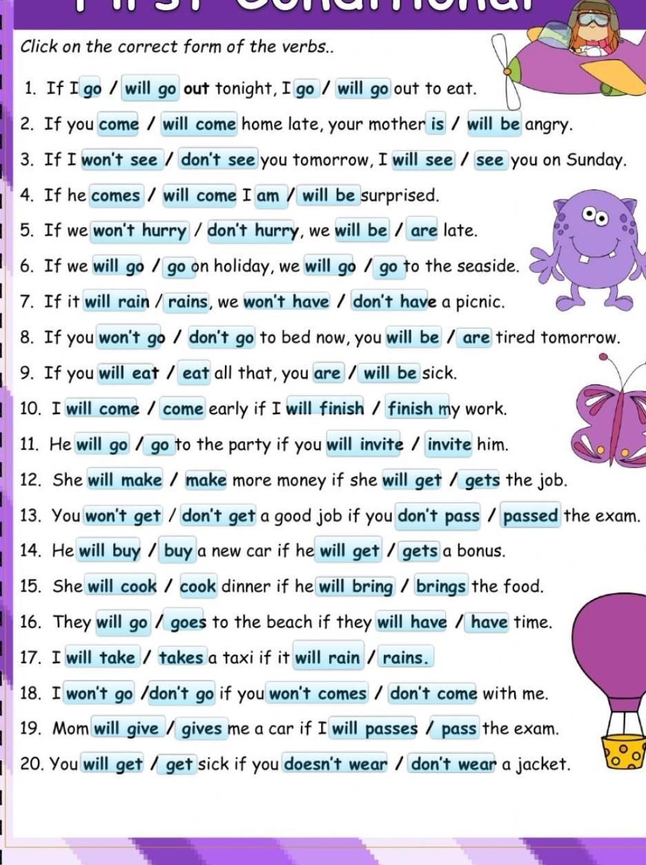 1) go, will go 2)come, will 3)don't see, will see 4)comes, will be 5)don't hurry, will be 6)go, will go 7)rain, won't have 8)don't go, will be 9)eat,Will Be 10) come, will finish 11)go, will invate 12) Make, will get 13)won't get, don't pass 14)will buy, Get 15) will cook, Bring 16)Will go, have 17) Will take, rains 18)Won't go, don't come 19)Will give, pass 20)will get, don't wear (тут Don't потому что с you используется do а не does)