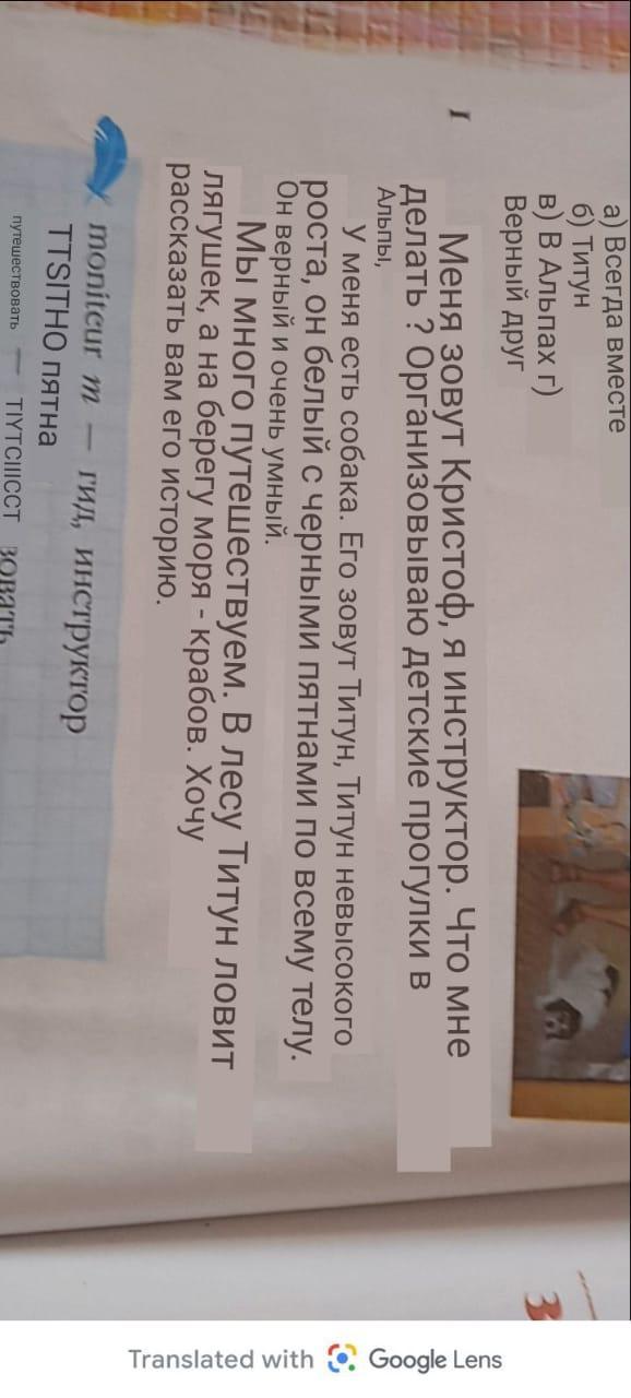 меня зовут Кристоф .Я инструктор. что я делаю? я организовываю прогулки для детей в Альпах.