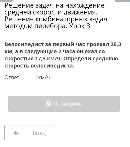 велосипедист за первый час проехал 20.3 км,а в следующие 2 часа он ехал со скоростью 17.3 км/ч определи среднюю скорость велосипедиста