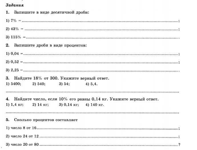 1)\ \ 7\%=0,07\ \ ,\ \ \ 43\%=0,43\ \ ,\ \ \ 115\%=1,15\\\\2)\ \ 0,04=4\%\ \ ,\ \ \ 0,52=52\%\ \ ,\ \ \ 2,25=225\%\\\\3)\ \ 18\%\ \ ot\ \ 300\ =\ 300\cdot 0,18=54\\\\4)\ \ 10\%\ \ ot\ \ x\ =\ 0,14\ \ \Rightarrow \ \ x=0,14\, :\, 0,10=1,4\\\\5)\ \ a)\ \ 8\ \ ot\ \ 16:\ \ \dfrac{8\cdot 100}{16}=50\%\\\\b)\ \ 24\ \ ot\ \ 12:\ \ \dfrac{24\cdot 100}{12}=200\%\\\\c)\ \ 20\ \ ot\ \ 180:\ \ \dfrac{20\cdot 100}{80}=25\%