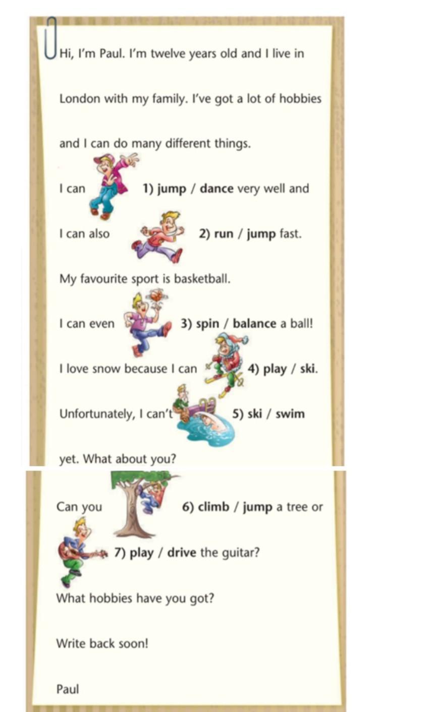 привет,я паул. двенадцать лет и я живу в Лондоне с моей семьёй. У меня много хобби и я могу много разных вещей . я могу очень хорошо танцевать (dance) и бегать (run). Мой любимый спорт баскетбол. я могу крутить (spin) мяч. я люблю снег потому что я катаюсь на лыжах (ski). к несчастью я не умею плавать (swim). А ты? Умеешь ли лазать по деревьям (climb)? или играть на гитаре (play). Какие у тебя хобби? до скорой встречи!