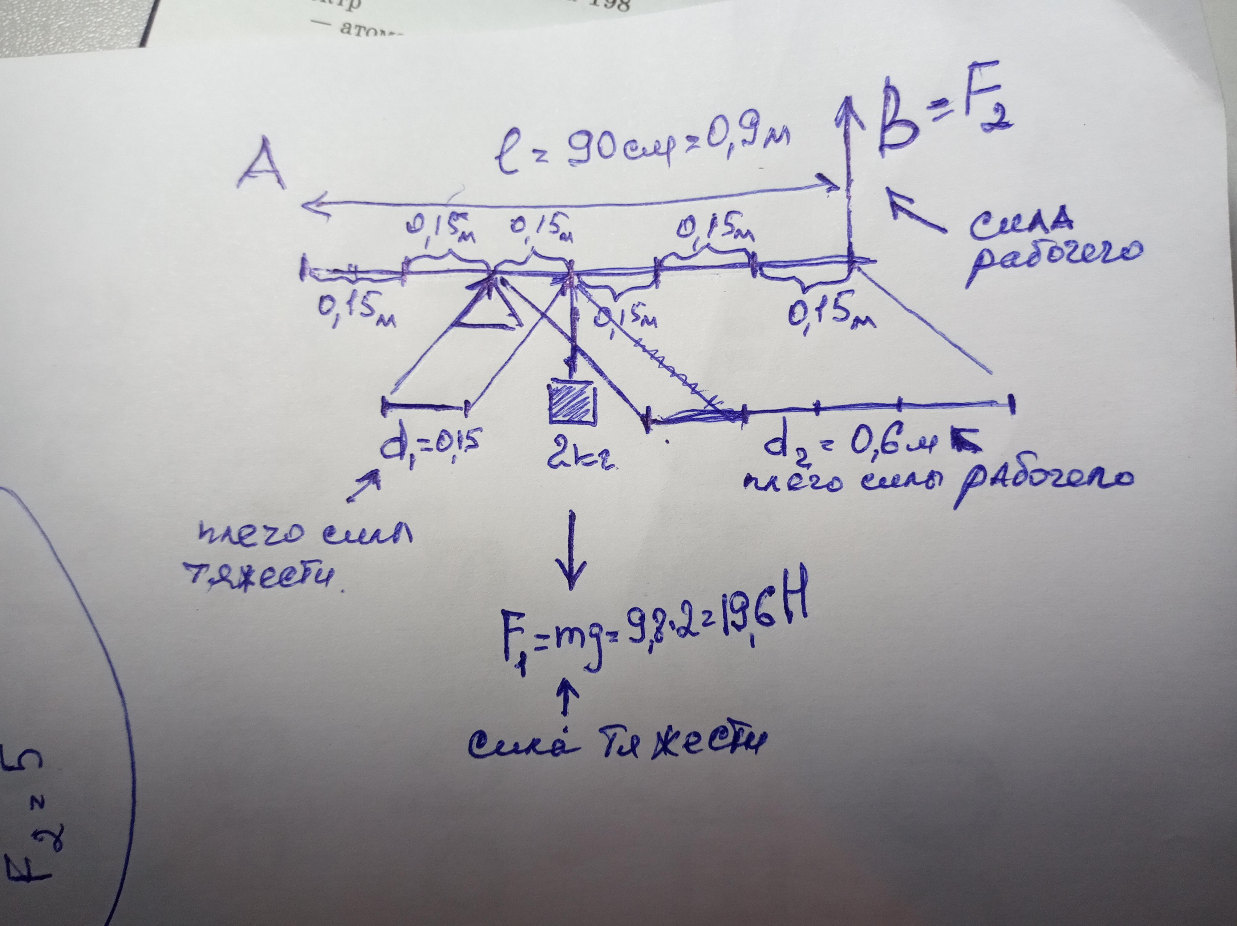Из золотого правила механики есть формула F1d1=F2d2, в которой говорится: во сколько раз плечо силы рабочего больше плеча силы тяжести, во столько же раз рабочий выигрывает в силе тяжести. На фото нам даны значения