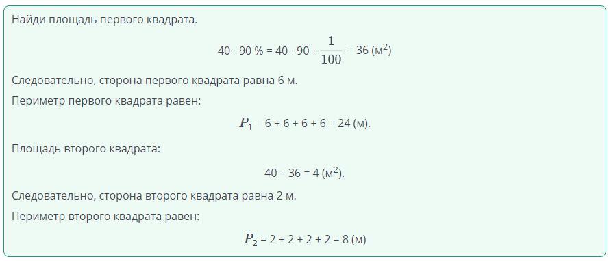 сумма площадей двух квадратов равна 40 м2. площадь первого квадрата составляет 90% от этой