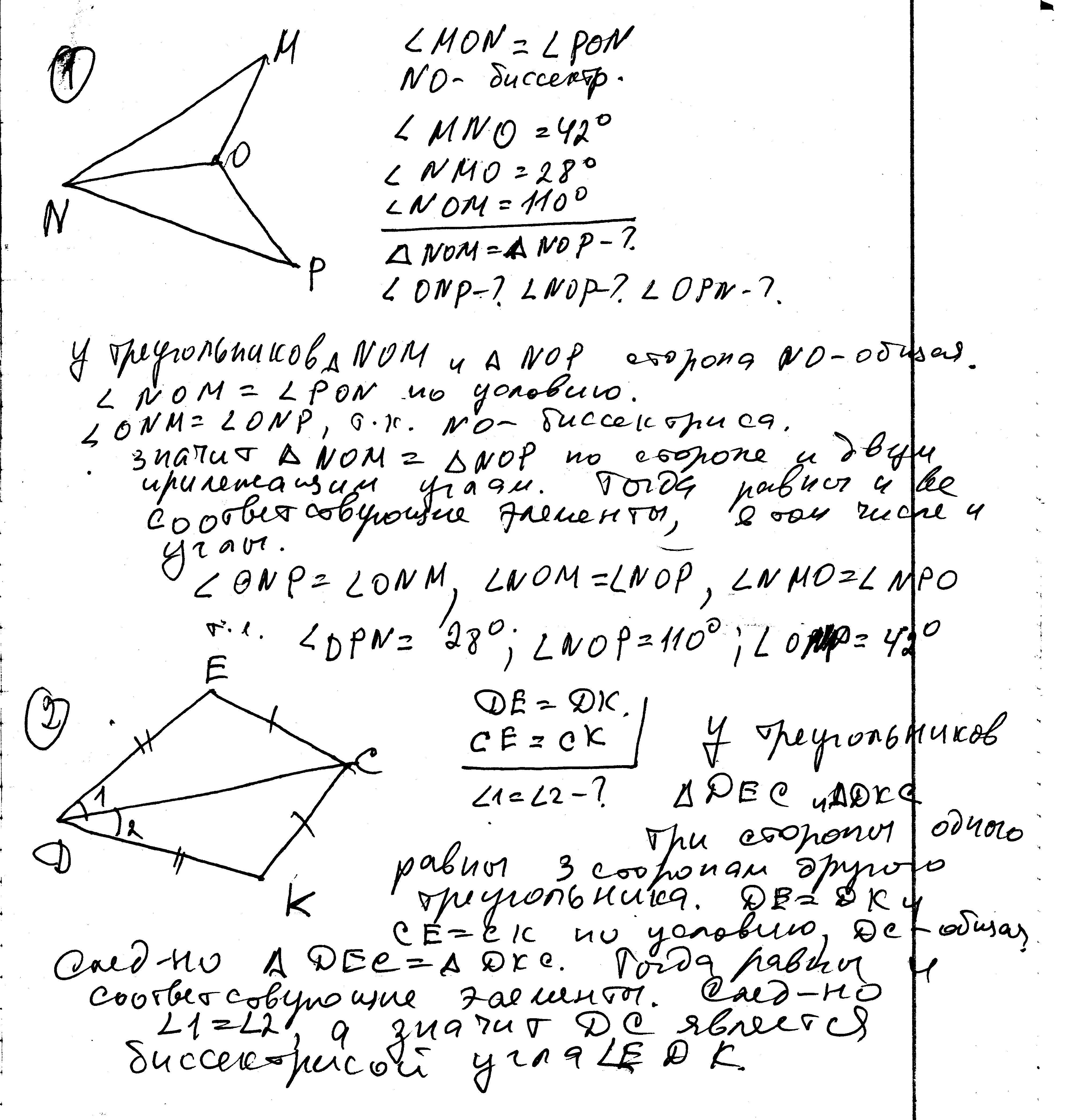 1. Докажите равенство треугольников MON и PON на рисунке, если ∠MON = ∠PON, а луч N0 – биссектриса угла