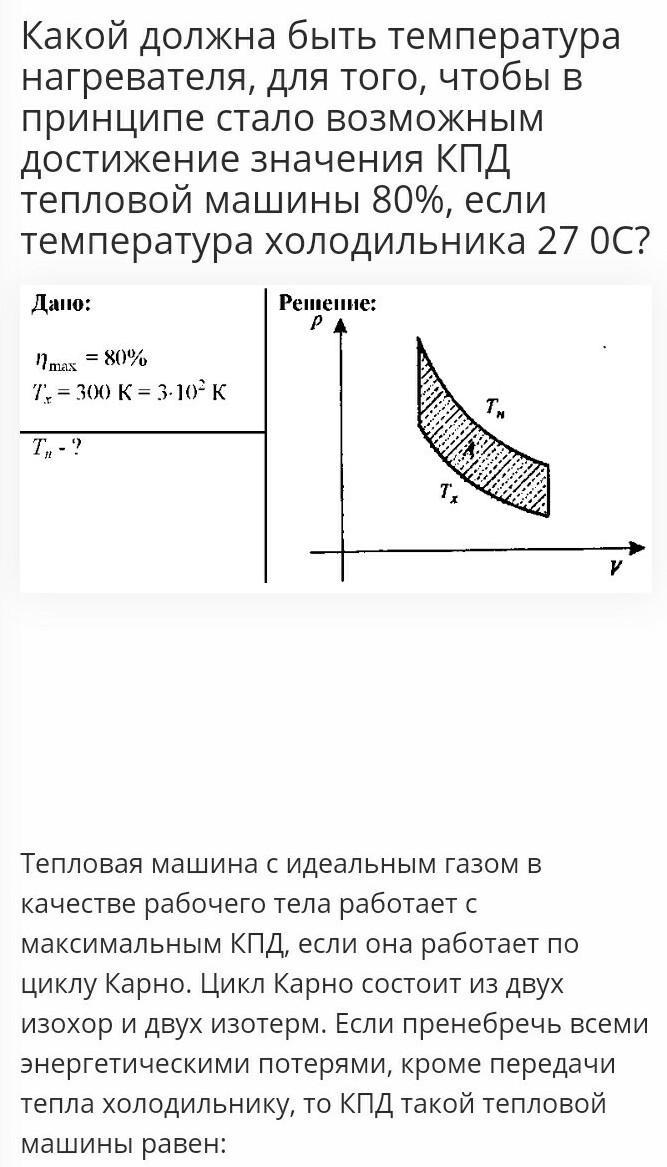 При какой температуре нагревателя КПД теплового двигателя будет равен 75%, если температура холодильника равна 270 С?