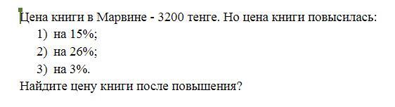 2) 3200 + (3200 * 0,26) = 3200 + 832 = 4032 (тг) - цена после повышения на 26%