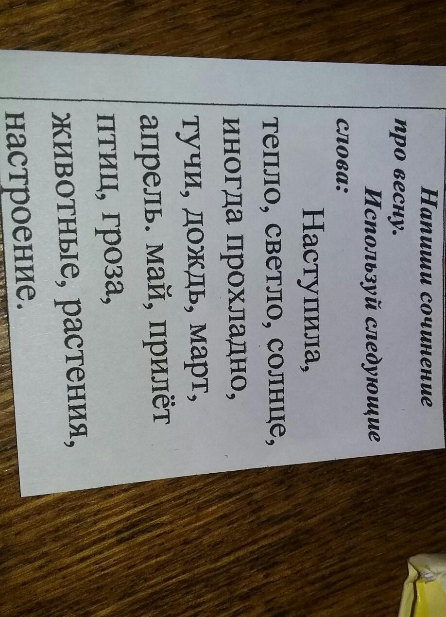 Наступила весна. День удлинняеться, становится более светло. Бывает иногда прохладно, но в основном тепло. Это означает, что скоро будет прилёт птиц. Растения и животные просыпаются после долгого сна. Недавно мы радовались первому весеннему дождю. Прошел март, май и апрель... Была последняя гроза. И наступило лето.