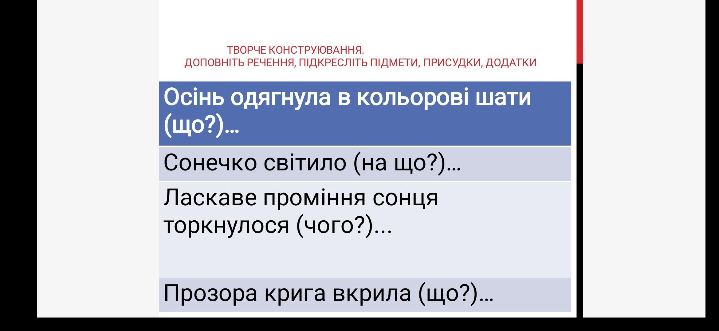 Объяснение: підмет підкреслюється 1 рискою; присудок - 2; додаток - пунктиром; означення - хвилястою лінією; обставина - пунктиром з крапками (_. _. _. _.).