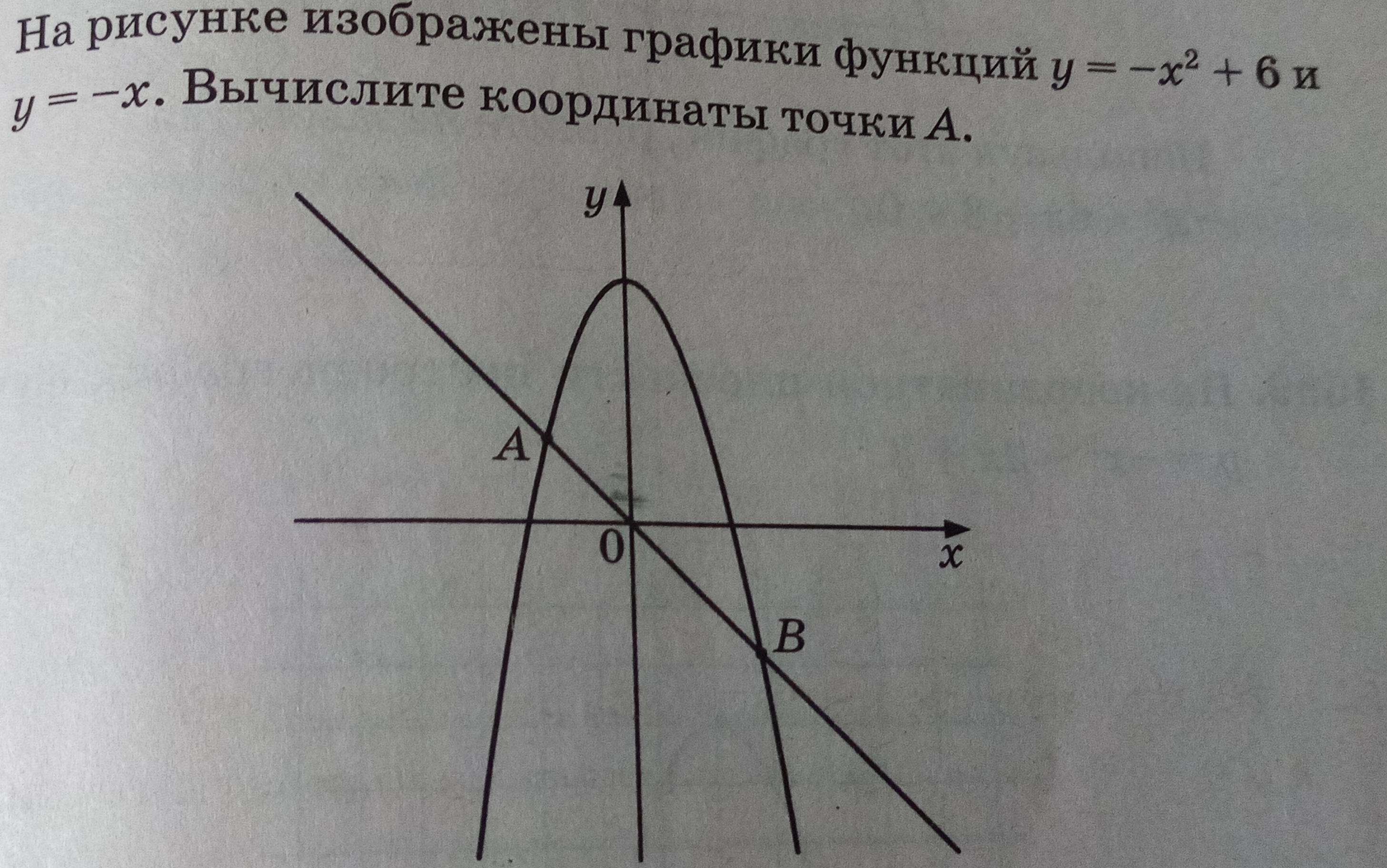 На рисунке изображены графики функций y=-x2+6 и y=x. Вычислите координаты точки А.....