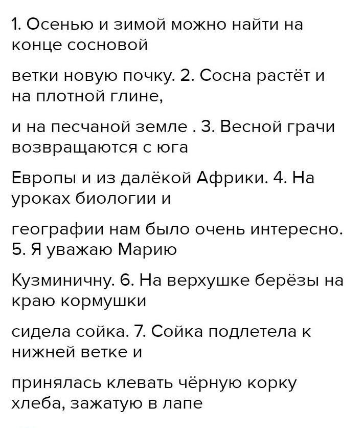 1.Осенью и зимой можно найти на конце сосновой ветки Новую почку. 2. Сосна растёт и на плотной глине и на песчаной земле. 3, Весною грачи возвращаются с юга Европы из далёкой Африки. 4 На географии нам было очень интересно. 5 Я уважаю Марину Кузминичную 6 На верхушке берёз на краю кормушек сидела сойка 7. Сойка подлетела к нижней ветке и принялась клевать Чёрную корку хлеба зажатую в лапу