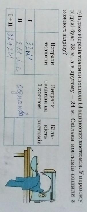 г) Із двох відрізів тканини пошили 14 однакових костюмів. У першому