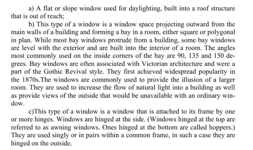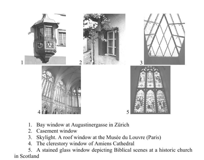 1. Bay window at Augustinergasse in Zürich - b) This type of a window is a window space projecting outward from the main walls of a building and forming a bay in a room, either square or polygonal in plan. While most bay windows protrude from a building, some bay windows are level with the exterior and are built inthe interior of a room. The angles most commonly used on the inside corners of the bay are 90, 135 and 150 degrees. Bay windows are often associated with Victorian architecture and were a part of the Gothic Revival style. They first achieved widespread popularity in the 1870s. The windows are commonly used to provide the illusion of a larger room. They are used to increase the flow of natural light into a building as well as provide views of the outside that would be unavailable with an ordinary window.