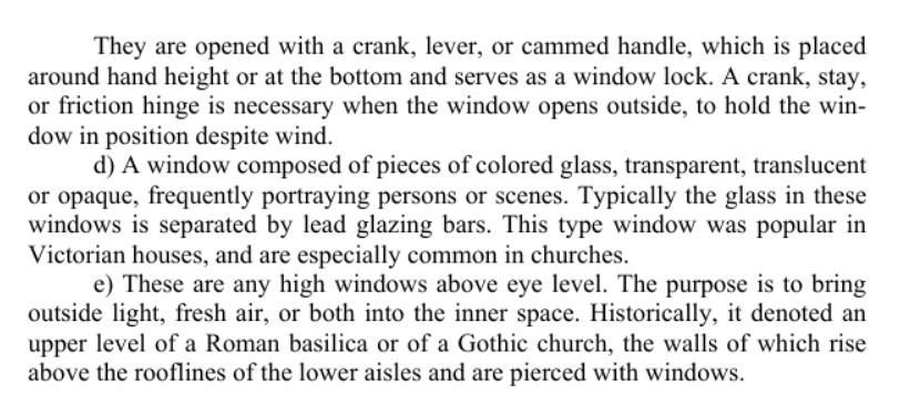 2. Casement window - c) This type of a window is a window that is attached to its frame by one or more hinges. Windows are hinged at the side. (Windows hinged at the top are referred to as awning windows. Ones hinged at the bottom are called hoppers) They are used singly or in pairs within a common frame, in such a case they are hinged on the outside. They are opened with a crank, lever, or cammed handle, which is placed around hand height or at the bottom and serves as a window lock. A crank, stay, or friction hinge is necessary when the window opens outside, to hold the window in position despite wind.
