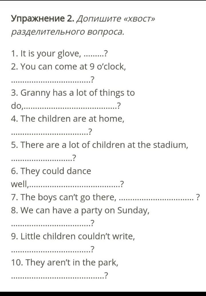 1.isn't it 2.can't you. 3.hasn't she 4.aren't they 5.aren't they 6.couldn't they 7can they 8.haven't we 9 could they 10.are they