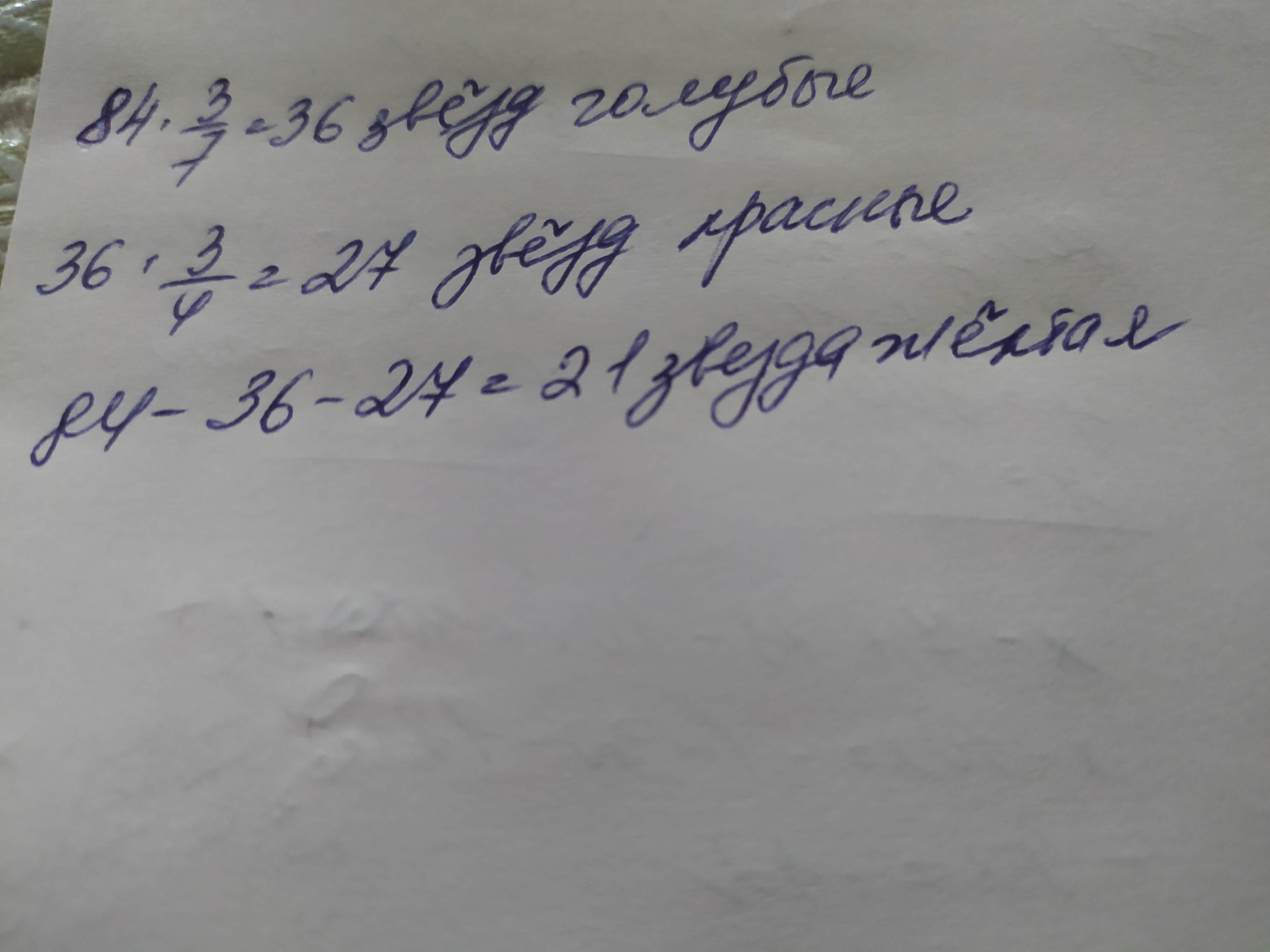 Пожалуйста помогите решить задачу! В обсерваторії досліджували 84 зірки. З них 3/7 усіх зірок виявились блакитними, 3/4 від блакитних-червоними, а решта зірок-жовтими. Скільки жовтих зірок виявили в обсерваторії?
