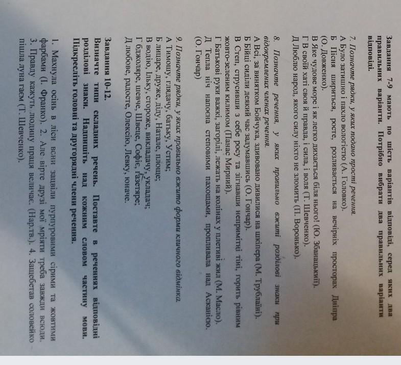 7)б,г 8)а, б,в (г не впевнений) 9)г 10) в першому реченні перед "вони" кома або тире(не повинно бути помилкою що поставити, але краще тире(як наслідок)) 11)"друзі мої" треба виділити комами. 12)Правду кажуть: людину праця величає.