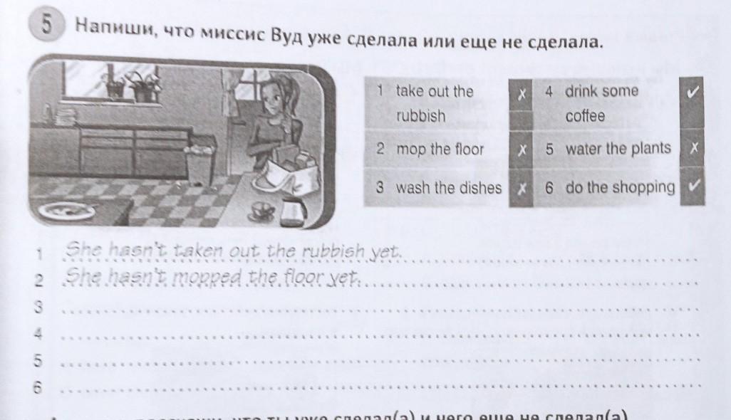 3)She hasn't wash the dishes yes 4)She hasn't drink some coffee yes.5)She hasn't water the plants yes.6)She hasn't do the shopping yes.