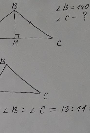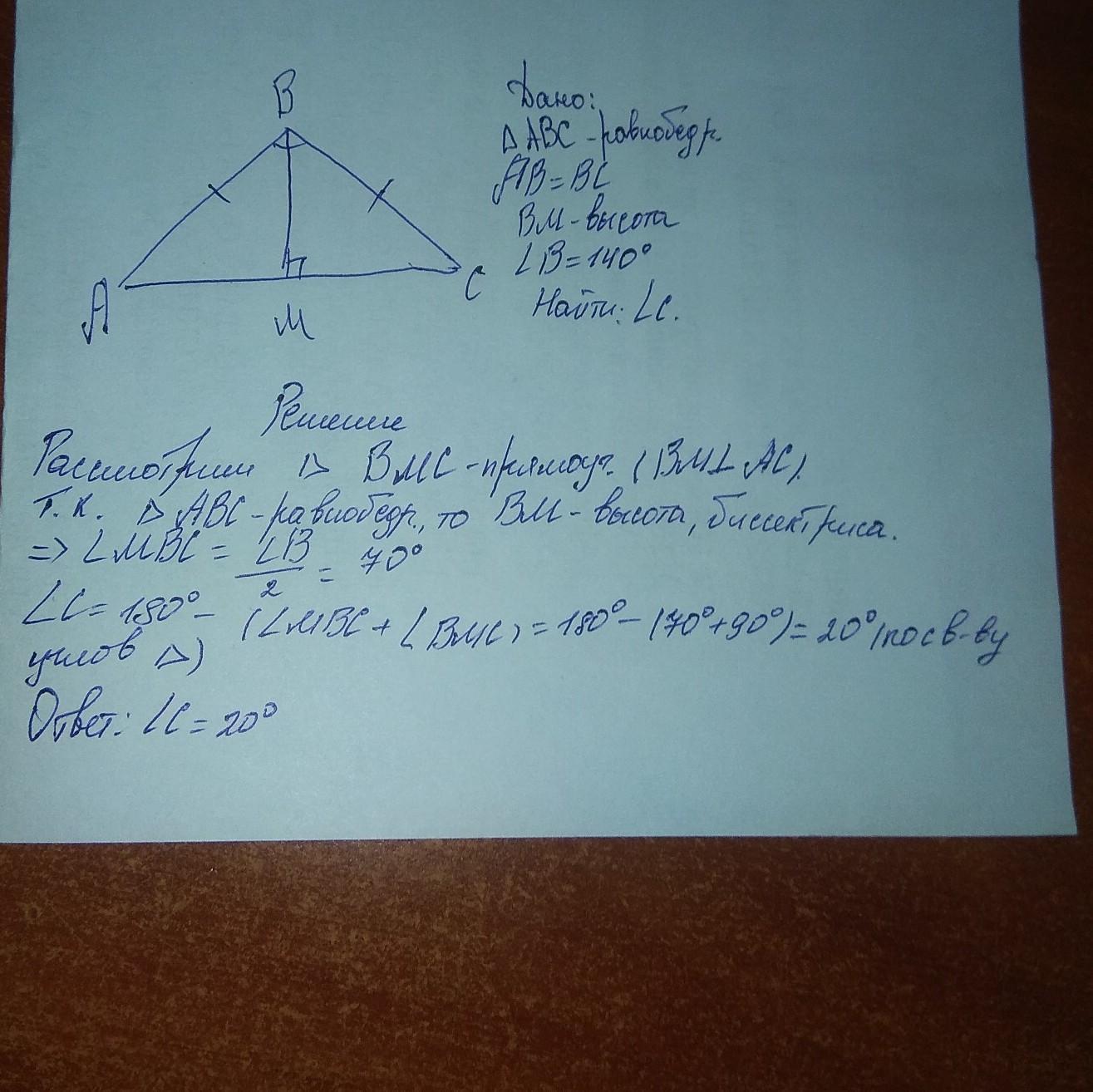 Объяснение: имеется равнобедренный треугольник АВС, высота ВМ, проведенная к стороне АС образует прямой угол ВМС и делит угол АВС пополам. Значит ∠СВМ=140/2=70°. Сумма острых углов в прямоугольном треугольнике равна 90°. Значит ∠С=90-∠МВС=90-70=20°