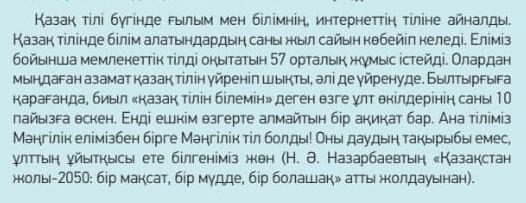 3-сұрақ:Ана тіліміз Мәңгілік елімізбен бірге Мәңгілік тіл болды!Оны даудың тақырыбы емес,ұлттың ұйытқысы ете білгеніміз жөн,--деген кімнің сөзі? Жауабы:( Н.Ә.Назарбаевтың сөзі)