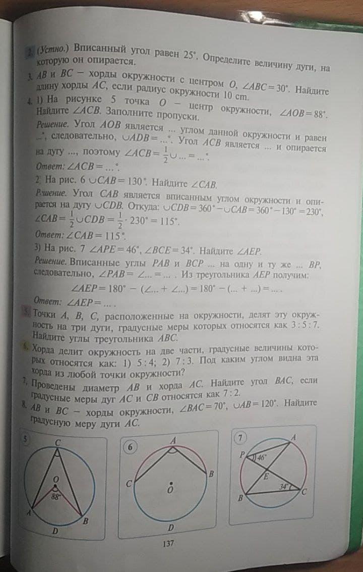 4) заполняем пропуске в 4ой задаче в подпункте 1. Аов центральный угол равный 88 , дуга адв равна 88 градусов, асв вписанный угол опирающийся на дугу адв . Значит асв равен половине дуги адв и равен 44 градусам