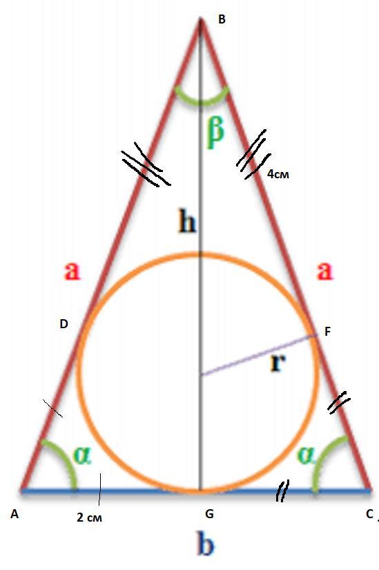 Дано: ΔАВС, АВ=ВС, вписане коло , FB=4cм, AG=2см