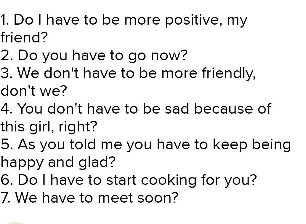 1. Должен ли я быть более позитивным, друг мой? 2. Тебе пора идти? 3. Нам не нужно быть более дружелюбными, не так ли? 4. Тебе не нужно грустить из-за этой девушки, правда? 5. Как вы мне сказали, нужно продолжать радоваться и радоваться? 6. Мне нужно начинать готовить для вас? 7. Скоро встретимся?