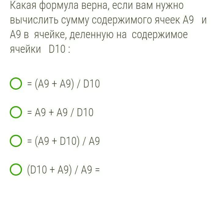 Сначала выполняются скобки, потом умножение и деление с начала примера, а после сложение и вычитание также с конца примера. Для того чтобы найти сумму ячеек A9 и ячеек A9, деленное на D10, нужно сначала поделить A9 на D10, а после сложить A9 с результатом деления.