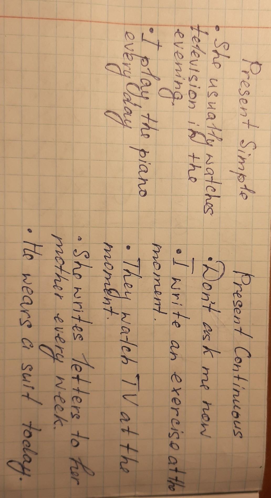 Распределите предложения в тетради на 2 колонки: Present Simple и Present Continuous. Don’t ask me now. I write an exercise at the moment . She usually watches television in the evening. I play the piano every day. Не often go to the cinema. They watch TV at the moment. She writes letters to her mother every week.